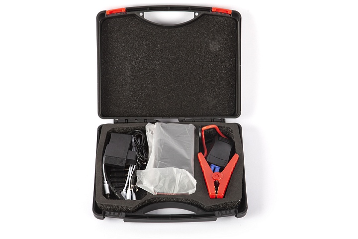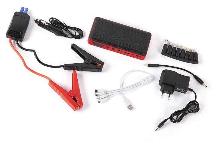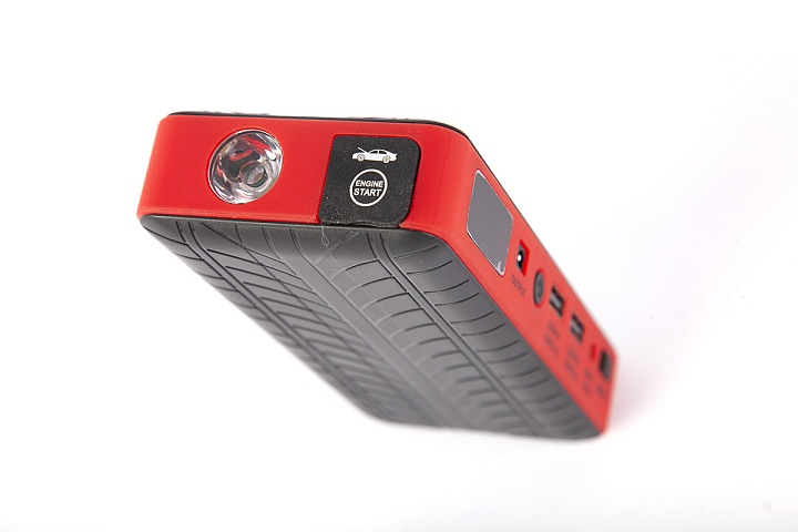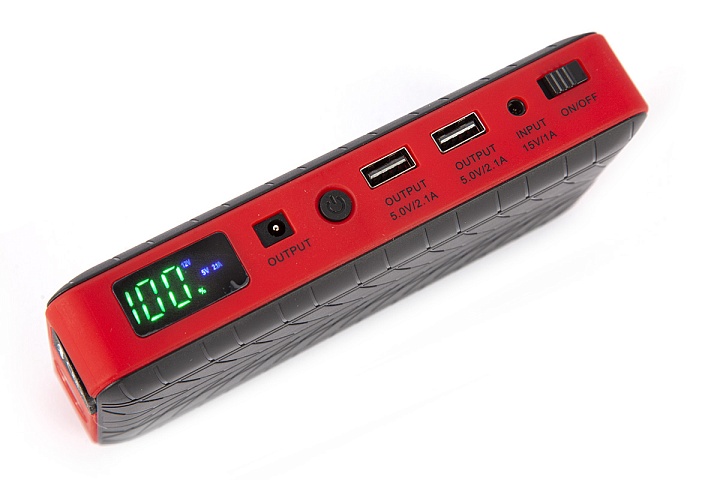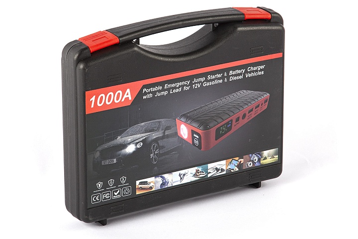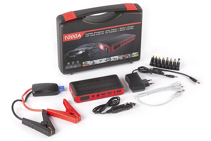 Портативное многофункциональное зарядное устройство предназначено для экстренного запуска двигателя легкового автомобиля при разряженном аккумуляторе, а так же для зарядки большинства видов мобильных телефонов, планшетов, В том числе возможна одновременная зарядка нескольких устройств. Данное устройство станет необходимым в продолжительных поездках на автомобиле, в семейных путешествиях и авто-кемпингах. Устройство имеет LCD-дисплей, 2 USB порта, выходное напряжение: 5В/2,1А, входное: 15В/1А, стартовый ток: 500 В (макс), пиковый ток - 1000 А, емкость - 18000 мАч. Само зарядное устройство следует заряжать от сети 220В или через разъем 12В в автомобиле. Питание отключается автоматически при отсутствии нагрузки или полной зарядке мобильных устройств.*На корпусе устройства предусмотрен встроенный светодиодный фонарь, который может работать в трех режимах: постоянный свет, стробоскоп и сигнал SOS.