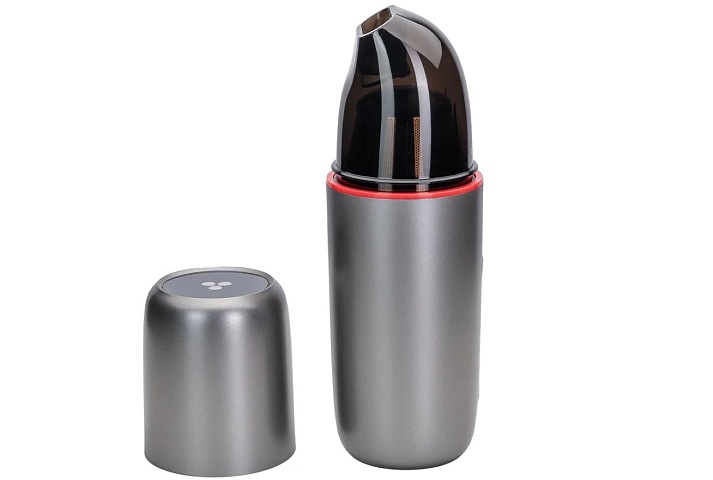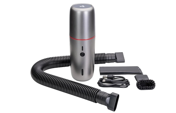 Маленький и удобный пылесос. Благодаря небольшим размерам может легко разместиться в бардачке автомобиля. Включается длительным нажатием на кнопку включения.