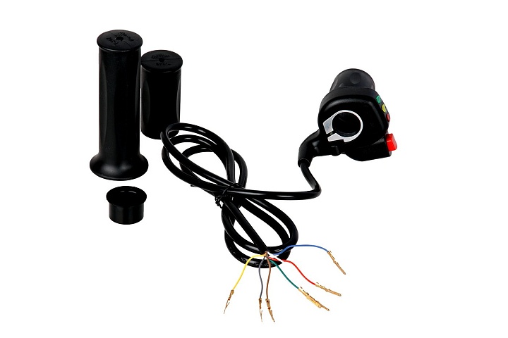 Эта модификация ручки «газа» входит в комплект электрооборудования самокатов Eltreco Rhino, оснащенных 36-вольтной аккумуляторной батареей. Данная модель электросамоката является оптимальным выбором для тех поклонников современного персонального электротранспорта, кто хотел бы повысить свою мобильность и независимость от переменчивых условий напряженного трафика. Ручка газа Eltreco Rhino этой серии дополнена интегрированным в корпус блоком-индикатором заряда АКБ, который предоставляет возможность обладателю электросамоката визуально контролировать уровень остаточного заряда встроенной аккумуляторной батареи. Три светодиода различного свечения помогут с первого взгляда определить оставшуюся емкость батареи: зеленый свидетельствует о полном заряде, желтый – о половине емкости, красный предупреждает о необходимости подзарядки. Конструктивно акселератор выполнен в форме «грипшифта» - вращается только половинка грипсы, устанавливаемой на руле электросамоката справа. Вращение ручки формирует передаваемый на контроллер сигнал, непосредственно управляющий электромотором самоката.