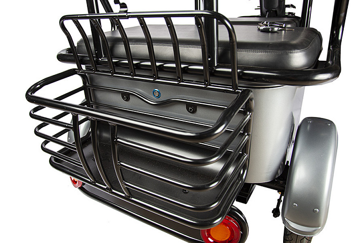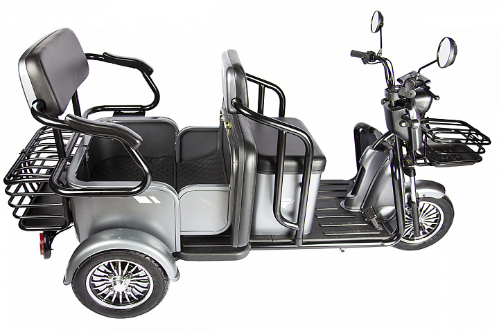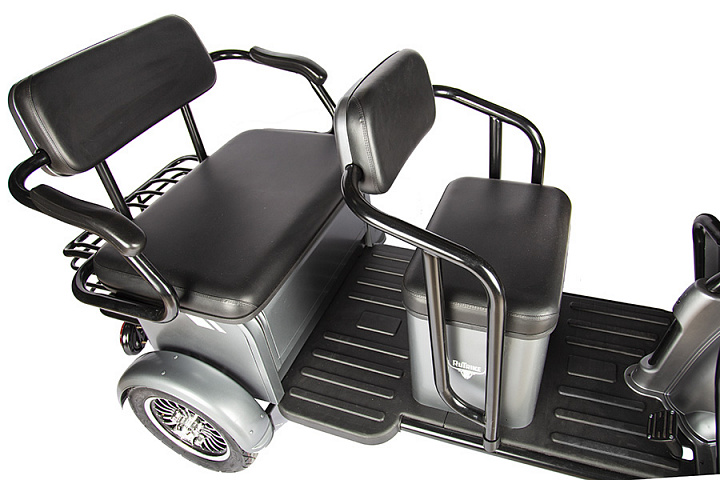 Красивый, большой и удобный электроскутер на трёх колёсах. Два больших мягких сиденья, широкие подножки и откидная конструкция заднего "дивана", которая превращает пассажирский скутер в грузовой, открывая доступ к вместительному багажному отделению!