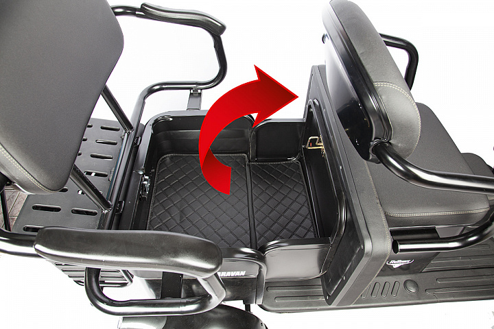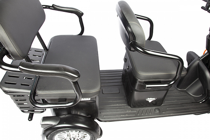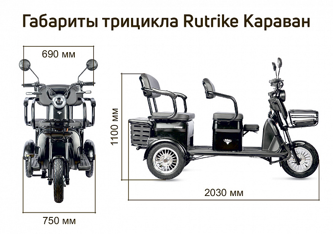 Трицикл Rutrke Караван - прекрасное универсальное транспортное средство! Задний ряд сидений откидывается, образуя вместительный кузовной отсек, тем самым превращая пассажирский электроскутер в компактный грузовичок, которому всегда найдётся работа в хозяйстве!