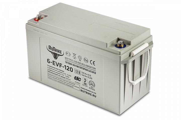 Rutrike 6-EVF-120 - необслуживаемая аккумуляторная батарея с системой рекомбинации газов (VRLA) произведенная по технологии AGM. Батареи выполнены по технологии внутреннего формования. В свинцовых пластинах, имеющих большую толщину по сравнению со стандартными аккумуляторами, используется экологичный запатентованный сплав без кадмия и мышьяка. Плотный сепаратор из углеволокна пропитан электролитом, изготовленным по технологии NANO GEL. Электролит находится в сгущенном состоянии, не даёт утечек и не требует долива воды на протяжении всего срока эксплуатации.