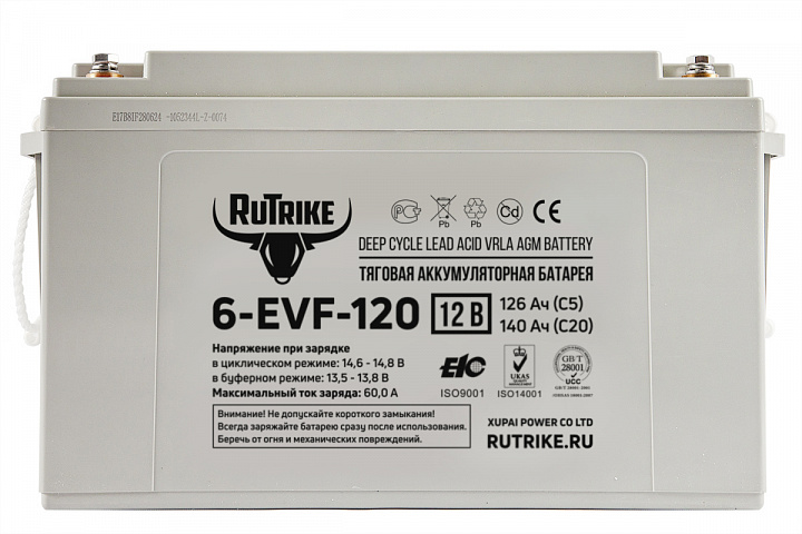 Тяговая аккумуляторная батарея Rutrike 6-EVF-120 поддерживает функцию быстрой зарядки с высокой силой тока до 60 Ампер, однако постоянно прибегать к быстрой зарядке мы не рекомендуем, поскольку количество рабочих циклов при постоянной зарядке с высокой силой тока снижается.